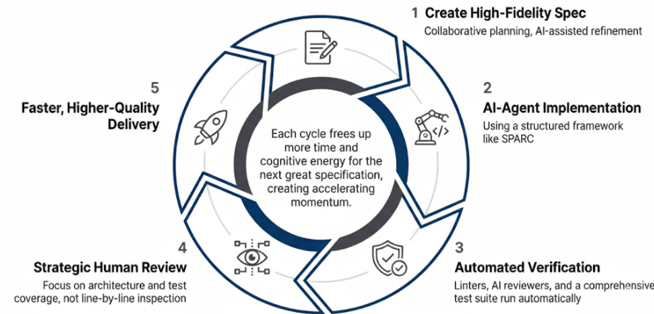 Cách nhìn này — chuyển từ kiểm tra code sang đánh giá bằng chứng — tương đồng với tư duy kiến trúc trong bài viết về Spec-Driven Development. Theo đó, đặc tả nên trở thành nguồn chân lý có thể thực thi, còn code chỉ là sản phẩm được sinh ra phía sau và có thể tái tạo.