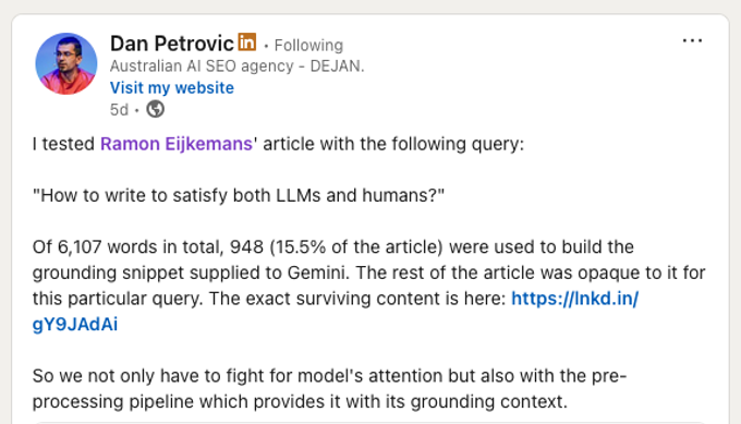 Một điều nữa trước khi bắt đầu. Nghiên cứu về hệ thống Gemini của Google cho thấy mỗi trang thường chỉ có khoảng 380 từ được chọn, bất kể độ dài trang. Dan Petrovic đã test chính bài này: trong 6.107 từ, chỉ 948 từ (15.5%) được dùng để tạo câu trả lời cho truy vấn “How to write to satisfy both LLMs and humans?”.